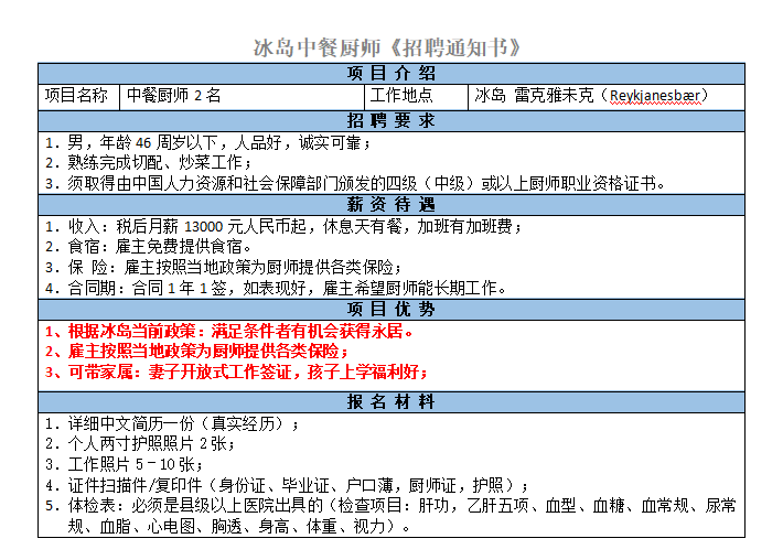 年龄43岁以内,3年以上炒锅经验;无地域要求;每天工作8小时,管吃管住26万冰岛克朗。