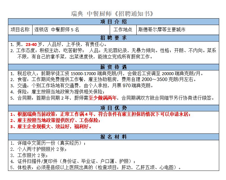 中餐厨师;菜系不限,熟练切配、炒锅;取得中级厨师证或中级厨师证以上;起薪税后20000瑞典克朗,后期视工作能力涨薪