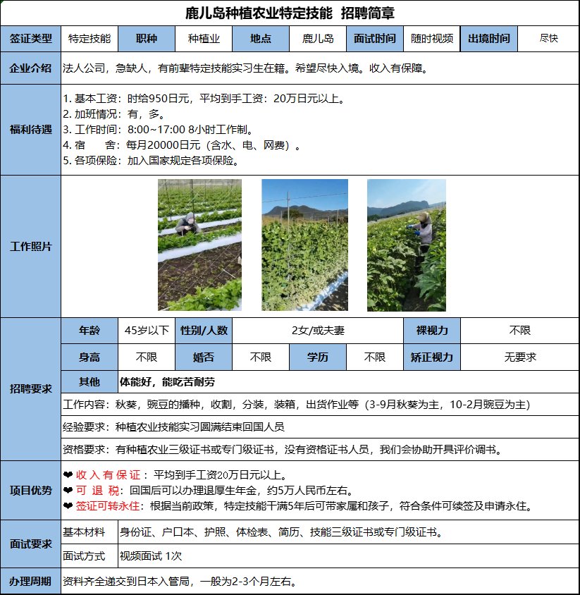 主要养鸡、喂料、打扫鸡舍等,平均到手工资18万日元左右,公司报销5万日元赴日机票,据个人表现有奖金,宿舍费用低。