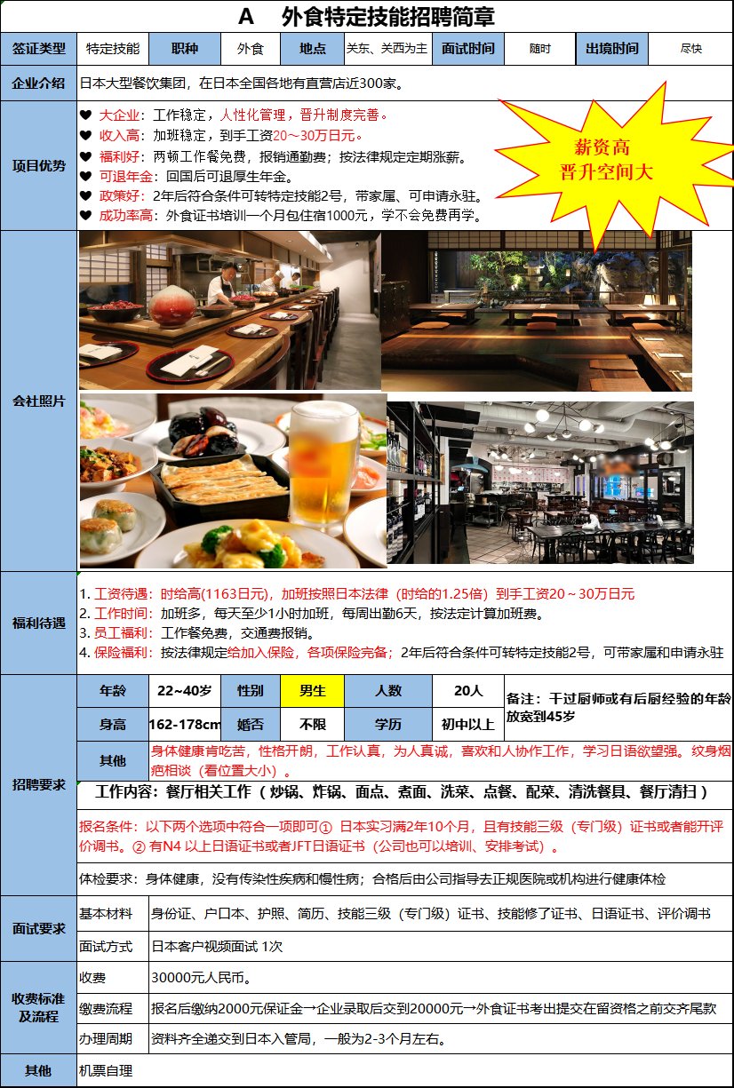 主要负责前厅服务和后厨帮厨(煮面,洗菜、配菜、清洗餐具)。免费提供工作餐,有奖金,有涨薪机会。回国后可退厚生年金。符合条件者干满2年后可转特定技能2号,可带家属,可申请永住。