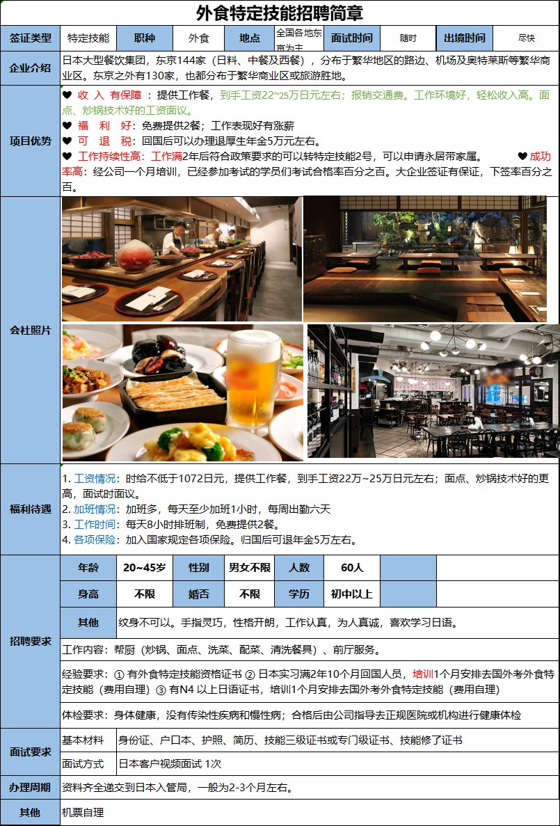 主要负责前厅服务和后厨帮厨(煮面,洗菜、配菜、清洗餐具)。免费提供工作餐,有奖金,有涨薪机会。回国后可退厚生年金。符合条件者干满2年后可转特定技能2号,可带家属,可申请永住。
