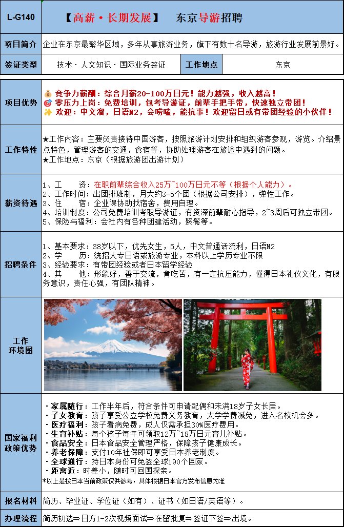 主要负责酒店的前台翻译,餐厅服务,客户迎送,接待等相关工作。正规工作签证,收入高,日语要求低,提供宿舍!