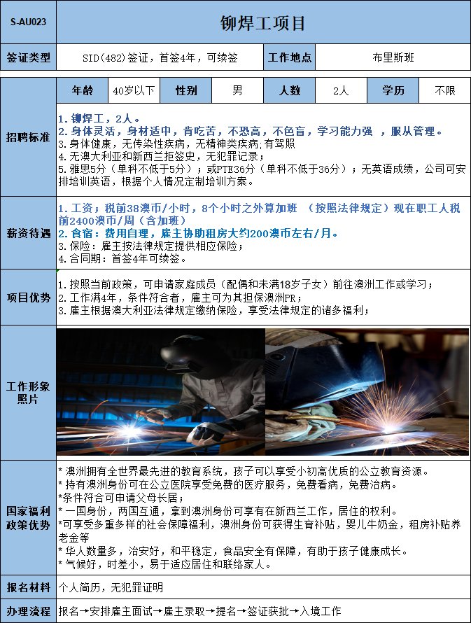焊接铝板和铁板,二保焊熟练工,年薪76515澳币,雇主支付12%养老保险。