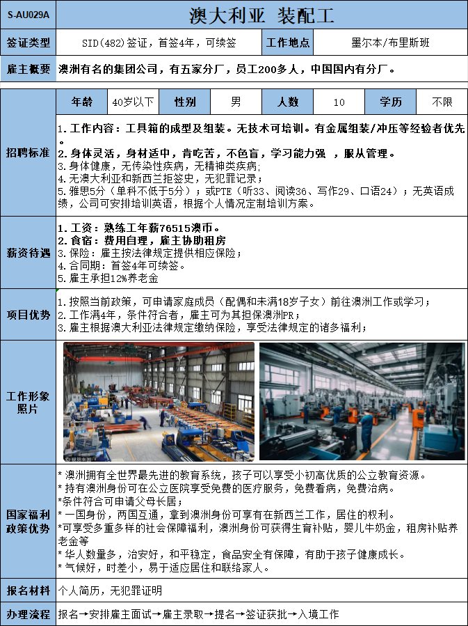 小笼车(拖车)的组装。无技术可培训,有电工,装配,电焊等经验者优先;熟练工年薪76515澳币。