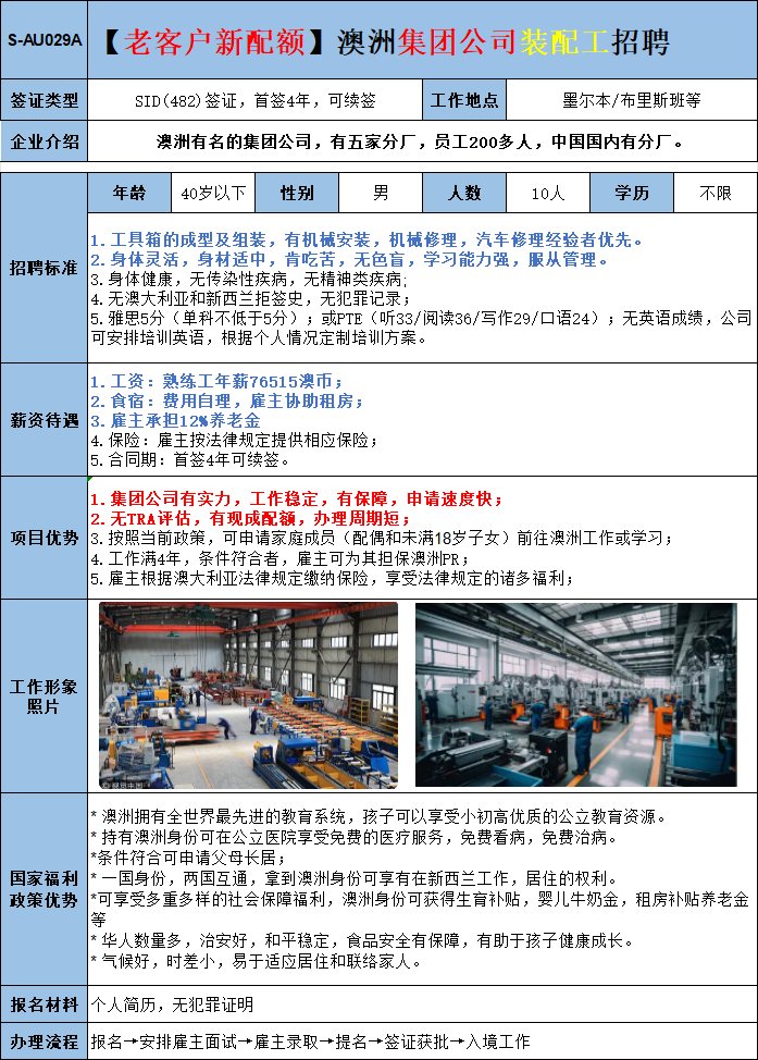 ✅ 现成名额,申请快,欢迎有成绩的朋友 ✅ 全澳多家仓库,雇主实力可靠 ✅ 无需技术背景,有体力劳动经验、能吃苦即可 ✅ 无相关经验可安排国内企业实习 ✅ 雇主支持女士作为主申请人,夫妻一起