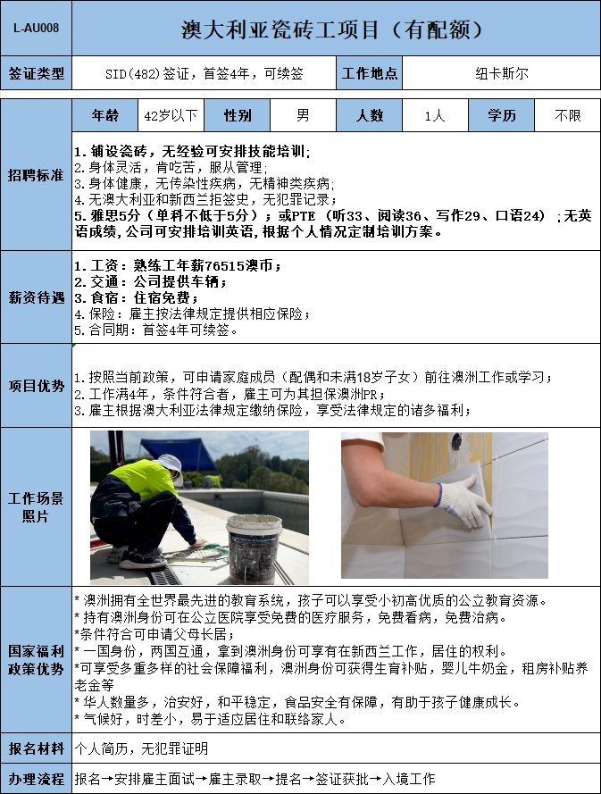 实力公司,主营家居建材,主要负责铺设瓷砖、地板,1年以上相关工作经验;年薪73150澳币,多劳多得,工资涨薪潜力极大