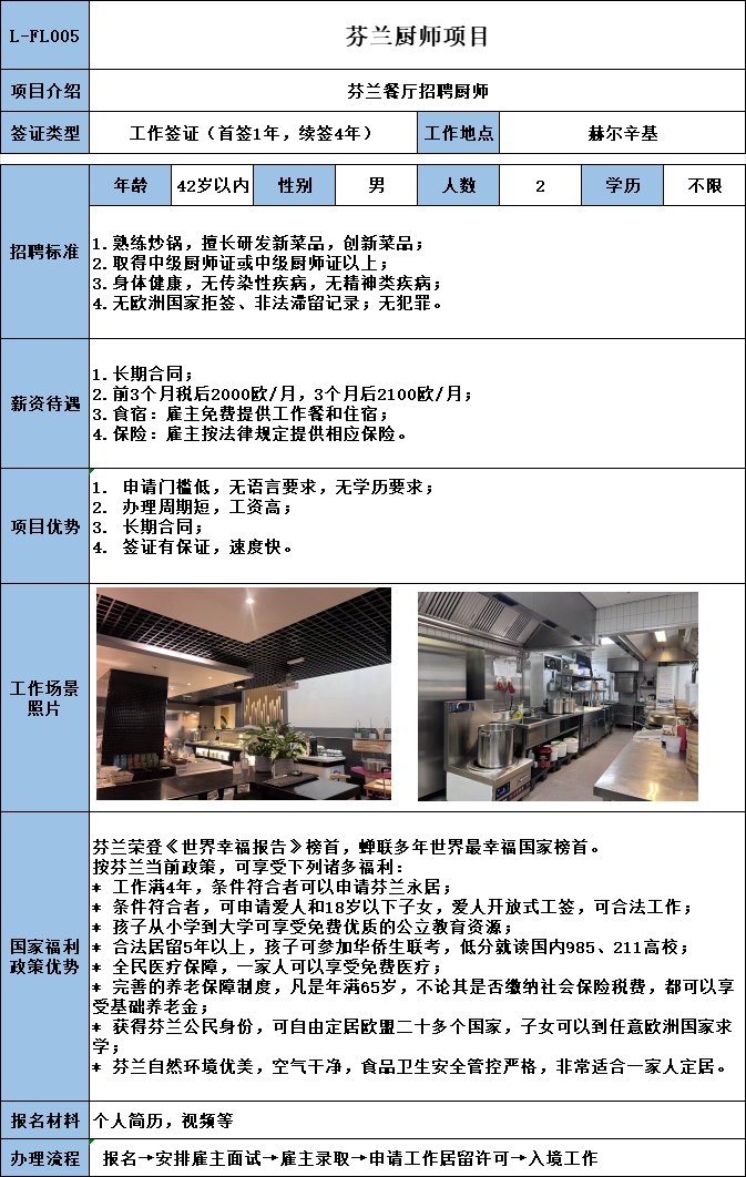 芬兰高薪项目:包吃住,包水电,住宿地点离餐厅步行十分钟,月薪2400欧(接近1.7w人民币)纯净到手收入,要求40岁以下踏实朴实的师傅,不限地域不限菜系。