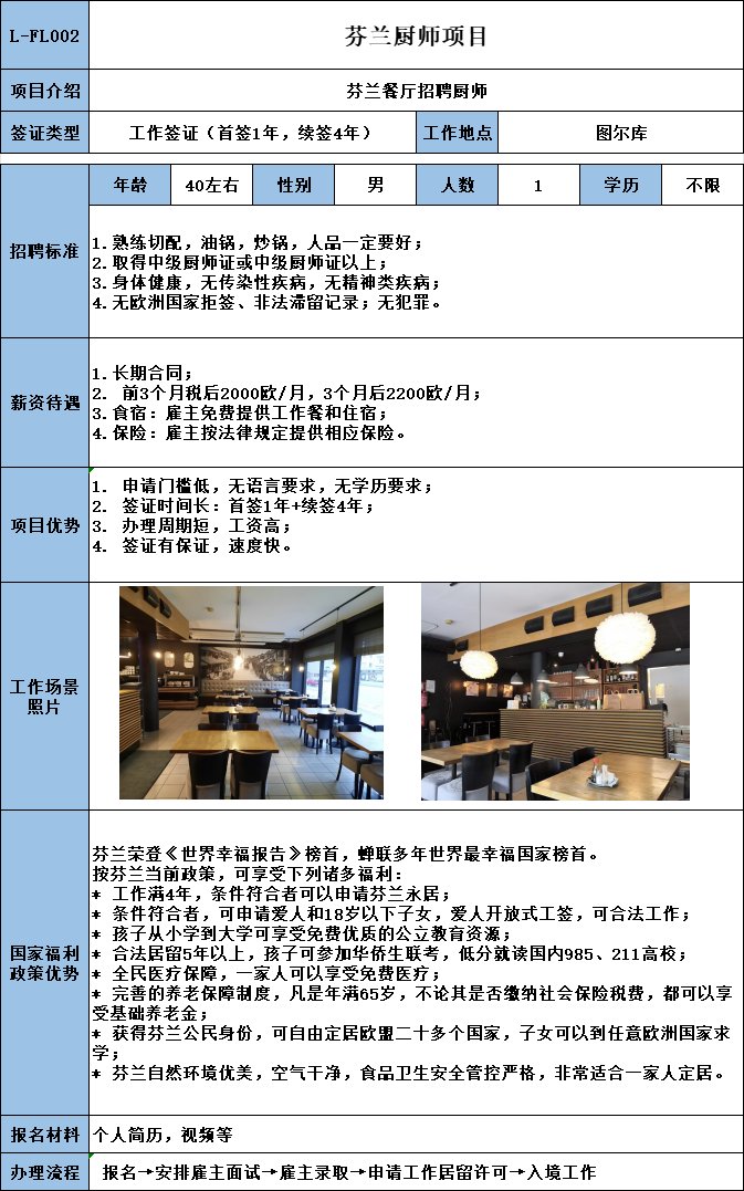 芬兰中餐厨师,薪资高福利好,厨师50岁以下均可,包吃包住税后2200欧,可移民,老板年轻大方,后期涨薪快幅度大。