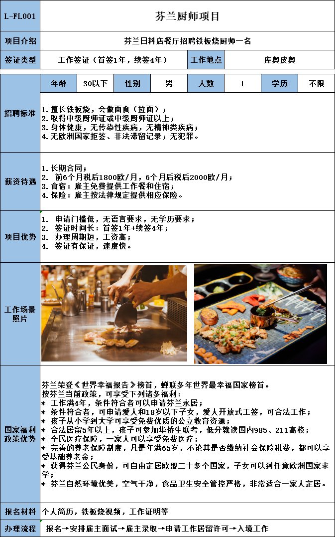 芬兰高薪项目:包吃住,包水电,住宿地点离餐厅步行十分钟,月薪2400欧(接近1.7w人民币)纯净到手收入,要求40岁以下踏实朴实的师傅,不限地域不限菜系。