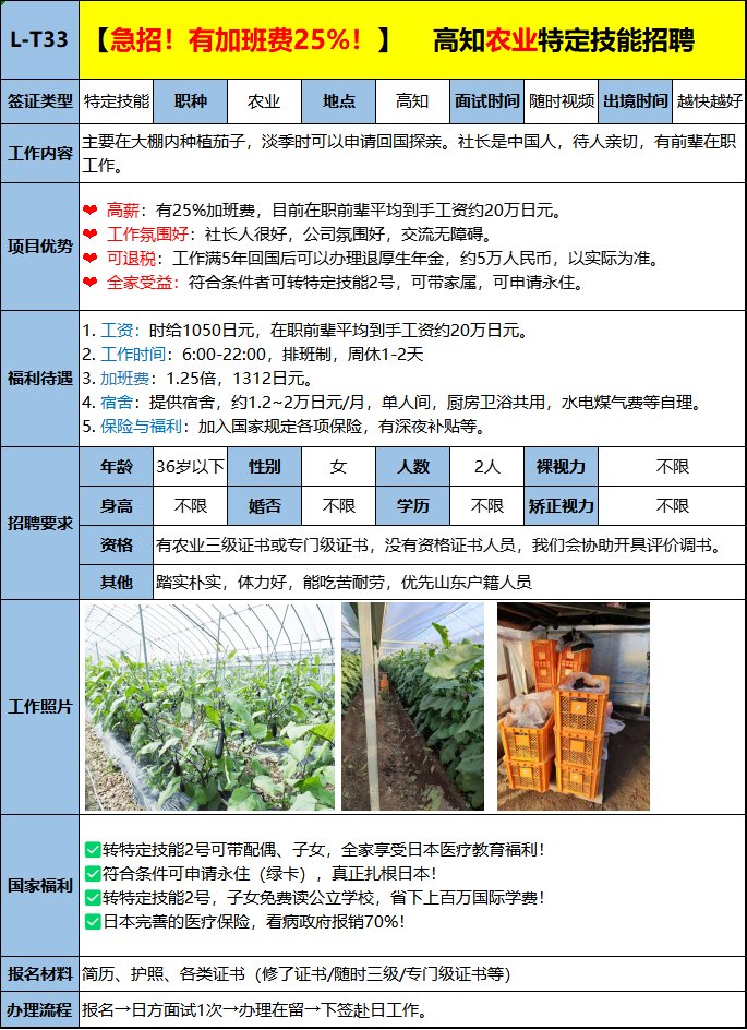 主要在大棚内种植茄子,淡季时可以申请回国探亲。 收入高,有25%加班费,目前在职前辈平均到手工资约20万日元左右。