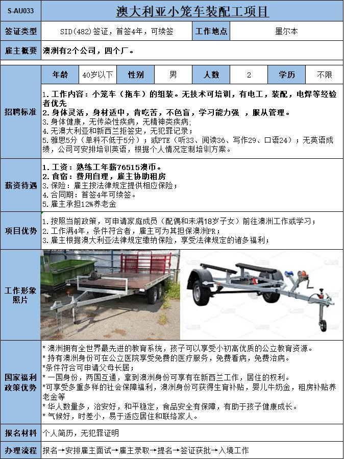 小笼车(拖车)的组装。无技术可培训,有电工,装配,电焊等经验者优先;熟练工年薪76515澳币。