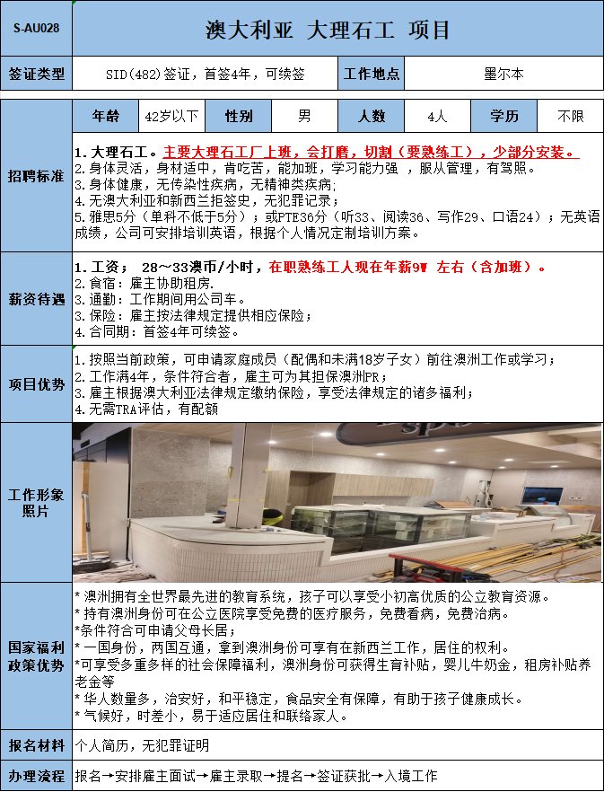 赴澳大利亚(墨尔本)- 大理石工 打磨/切割