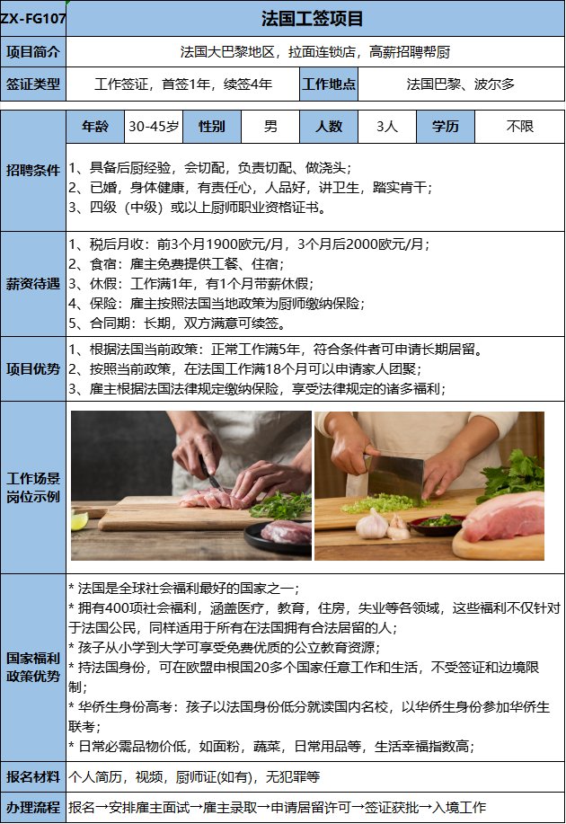有后厨经验或有相关餐饮经验优先,不会者可培训;包吃住,税后:1900欧元/月,后期根据个人情况涨薪。