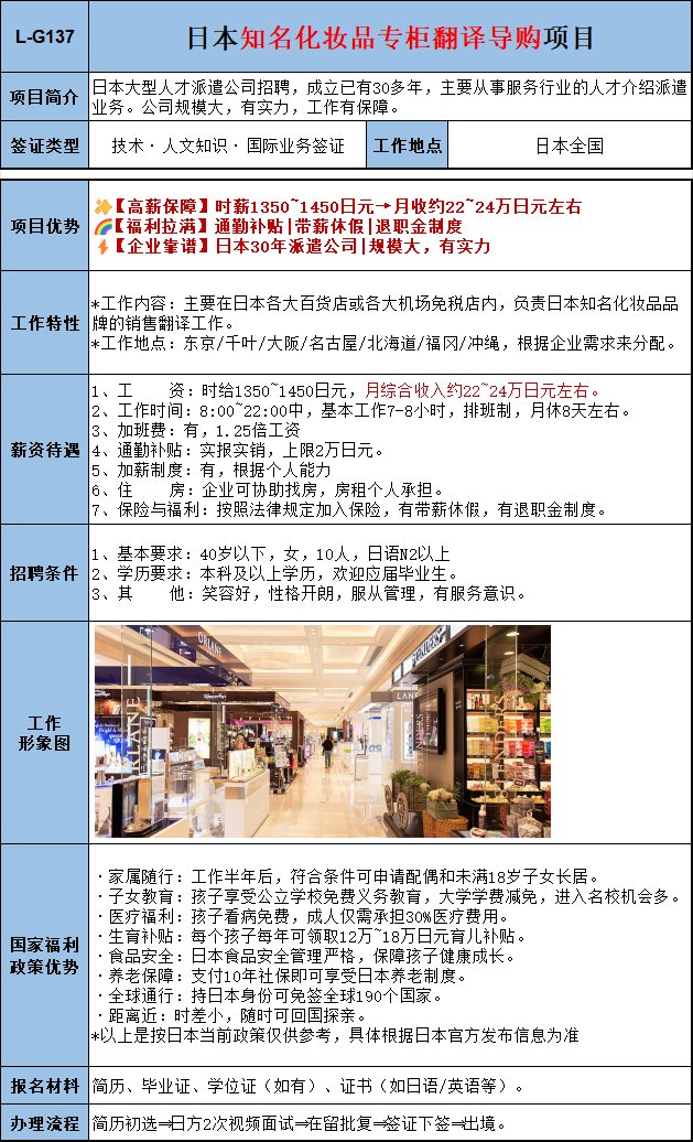 主要从事日本各大机场的免税店及城市中的药妆店,化妆品、药妆的翻译和销售工作。工作签证。要求工作认真细心,责任心强,服从意识强。