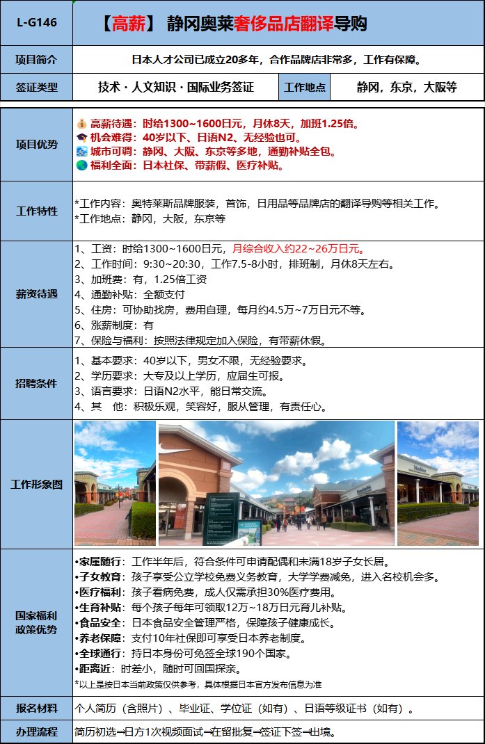 主要负责奥特莱斯各大品牌店内的日语翻译、导购等相关工作;老客户,公司从事人才介绍派遣业务数年,经验丰富。正规工作签证,收入高,有宿舍,工作环境好,办理速度快!