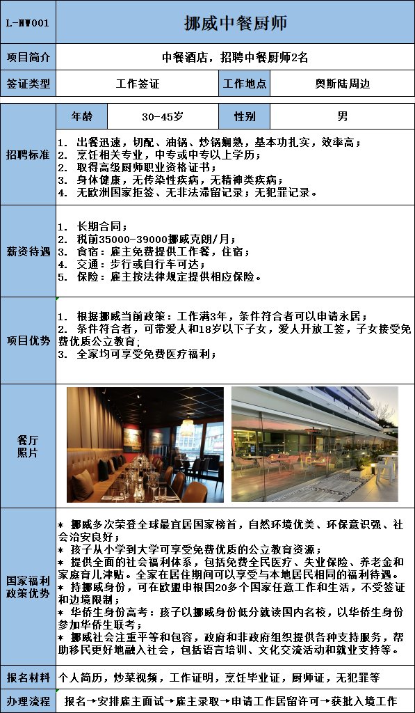 45岁以下、男性、高级厨师证、粤菜菜系,或亚洲融合菜,会面点者更佳。税后21000挪威克朗/月以上,加班有加班费。