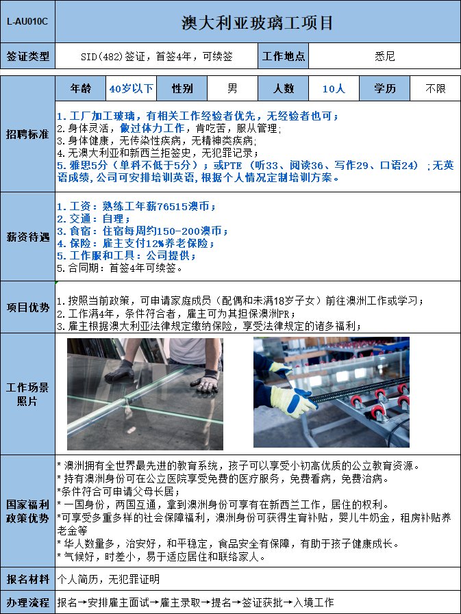 喷涂工,有相关工作经验者优先,无经验者也可;熟练工年薪76515澳币;雇主支付12%养老保险.