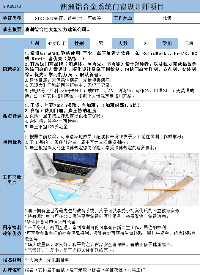 赴澳大利亚(北领)- 铝合金系统门窗设计师