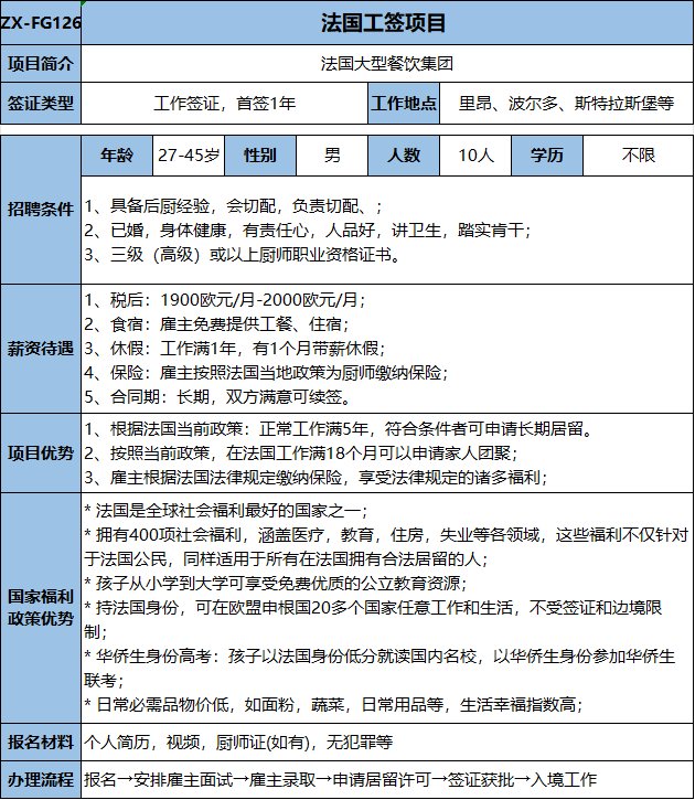 有后厨经验或有相关餐饮经验优先,不会者可培训;包吃住,税后:1900欧元/月,后期根据个人情况涨薪。