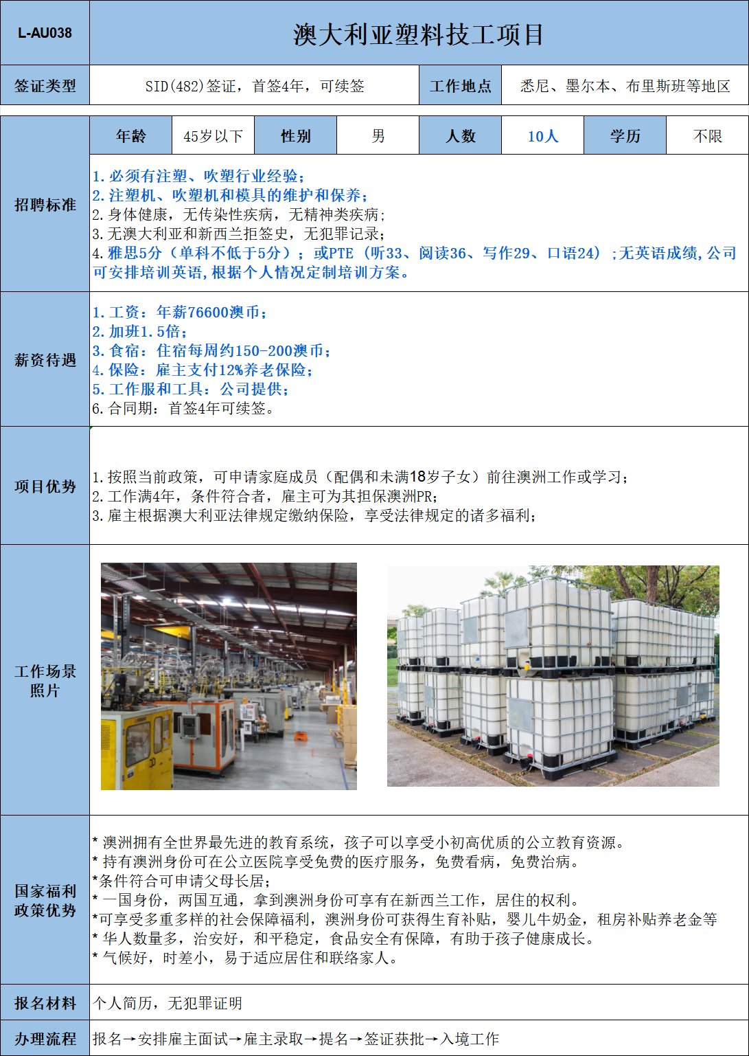 赴澳大利亚(悉尼/墨尔本/布里斯班)- 塑料技工