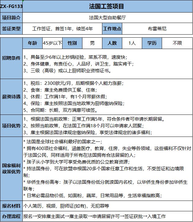 有后厨经验或有相关餐饮经验优先,不会者可培训;包吃住,税后:1900欧元/月,后期根据个人情况涨薪。