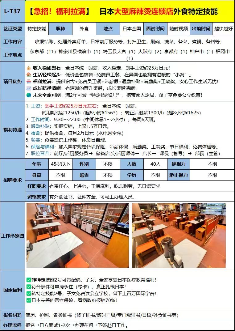主要负责前厅服务和后厨帮厨(煮面,洗菜、配菜、清洗餐具)。免费提供工作餐,有奖金,有涨薪机会。回国后可退厚生年金。符合条件者干满2年后可转特定技能2号,可带家属,可申请永住。