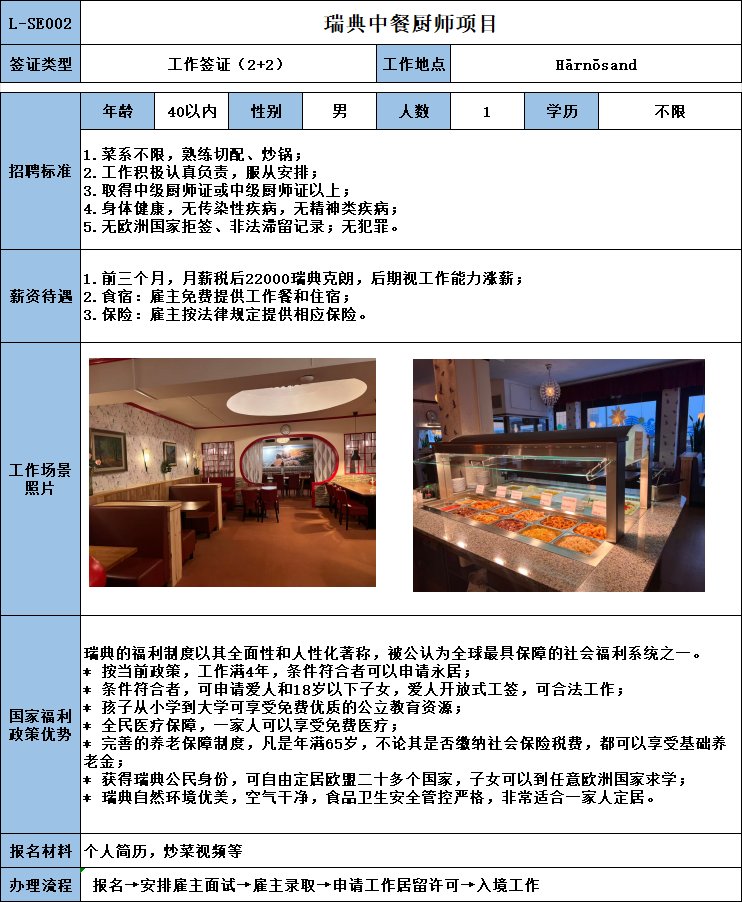 中餐厨师;菜系不限,熟练切配、炒锅;取得中级厨师证或中级厨师证以上;起薪税后20000瑞典克朗,后期视工作能力涨薪