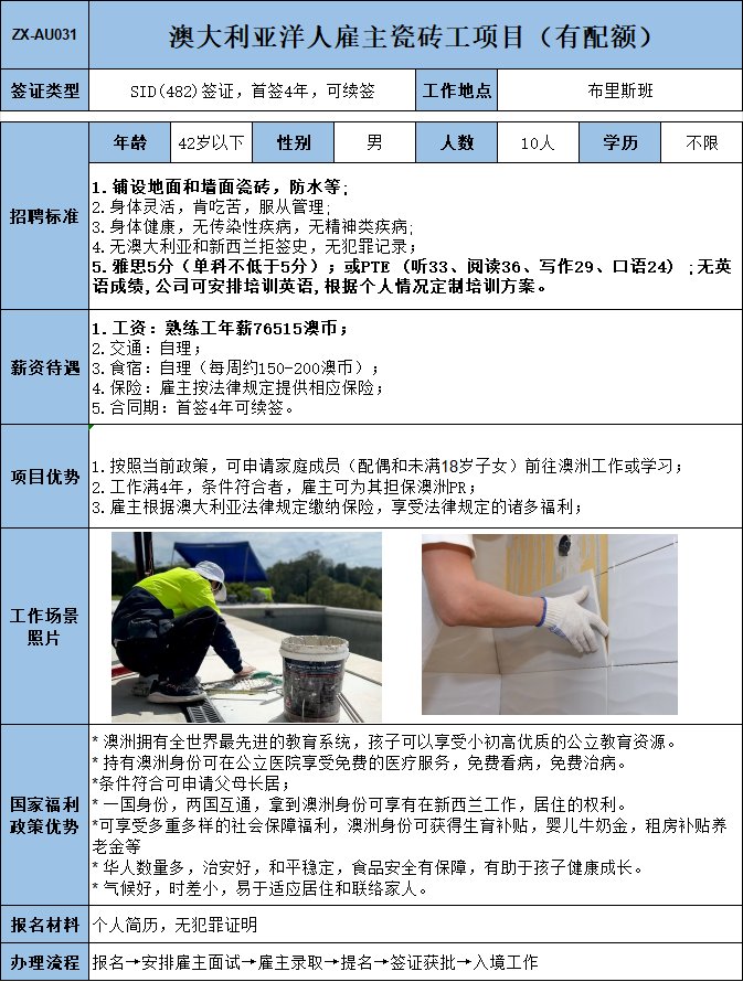 实力公司,主营家居建材,主要负责铺设瓷砖、地板,1年以上相关工作经验;年薪73150澳币,多劳多得,工资涨薪潜力极大