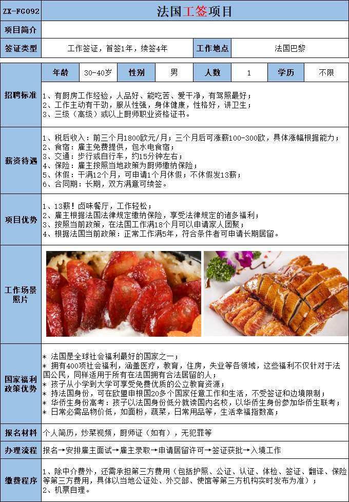 具备后厨经验,会切配、油锅,负责后厨切配、油锅工作;税后:2000欧元/月,后期根据个人能力涨薪.