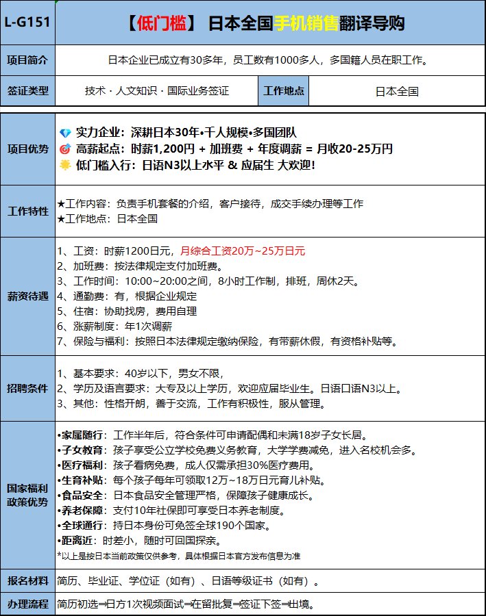 主要负责药妆店翻译和销售工作,上市公司就职,稳定有保障,晋升制度完善;基本工资22万日元起