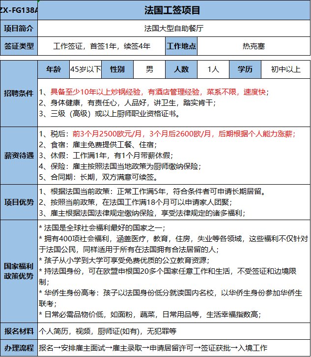 具备后厨经验,会切配、油锅,负责后厨切配、油锅工作;税后:2000欧元/月,后期根据个人能力涨薪.