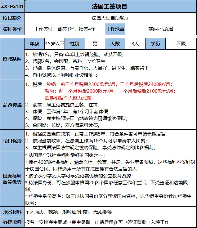炒锅1名,具备6年以上炒锅经验,菜系不限;帮厨2名,会切配,备料,收拾卫生;炒锅:前三个月税后2300欧元/月,三个月后税后2400欧/月;帮厨:前三个月税后2000欧元/月,三个月后税后2100欧元/月;后期根据个人能力涨薪。