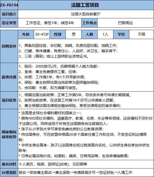 具备后厨经验,会切配、油锅,负责后厨切配、油锅工作;税后:2000欧元/月,后期根据个人能力涨薪.