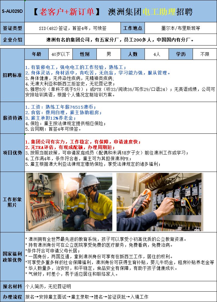 赴澳大利亚(墨尔本/布里斯班)- 电工助理